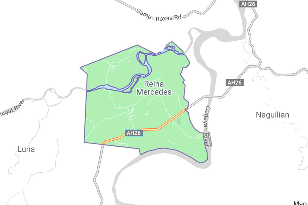 The Municipality of Reina Mercedes is situated in Central Isabela. It is a satellite municipality of Cauayan, a growth center of the province of Isabela. Its terrain is generally flat rolling. It is bounded on the north by Naguilian; on the east by Cagayan River; on the south by Cauayan; and on the west by Luna. The poblacion is approximately 23 kilometers south of Ilagan on the national highway and 10 kilometers north of Cauayan.